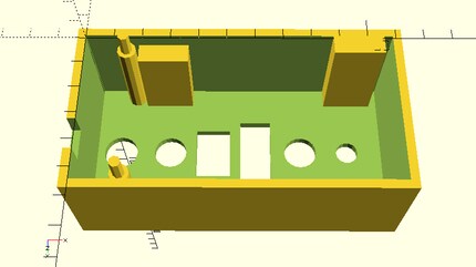 Ich habe ein sehr einfaches Gehäuse entworfen. Es besteht aus einem Viereck, dem ein kleineres Viereck abgezogen wurde, einer zusätzlichen Leiste als Tischkantenauflage, Löcher für die Schalter und Stützen für den Arduino und die Schraubzwingen. Und zu Guter Letzt ein Deckel als Abschluss. Auch hier gilt: Komplizierter geht immer, z.B. schräge Wände, Rundungen und so weiter.