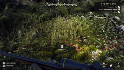 Weil sich meine Beute aus dem Staub gemacht hat, teleportiere ich mich kurzerhand zurück in die Lodge. Das resetet meist die Position der Tiere und ich kann das Spielchen von vorne beginnen. Ich brauche insgesamt fünf Anläufe und die letzten 250 Meter schleiche ich kriechend an mein Ziel heran. Ich nehme Luft, respektive drücke dafür die Shift-Taste, ziele aufs Herz und drücke ab. Die Herde rennt davon, mein Hirsch leider auch. Allerdings hinkt er. Getroffen habe ich ihn also, allerdings nicht sauber, sonst wäre er an Ort und Stelle umgekippt. Zum Glück befindet er sich auf einem offenen Feld, sodass ich nicht lange den Blutspuren folgen muss. Endlich. Mein erster richtiger Abschuss. Beim Beanspruchen der Beute sehe ich in hübscher 3D-Röntgen-Animation, wo meine Kugel das Tier getroffen hat