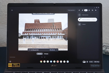 The Chromebook Plus has minimum requirements which enable Google to run several AI functions on the notebooks. I already know the magic eraser from Pixel smartphones and find it a nice touch to be able to use it on a notebook. People or other distracting objects can be removed from an image with just a few clicks. If I’m not satisfied with the colours of the sky, I can also colour it.