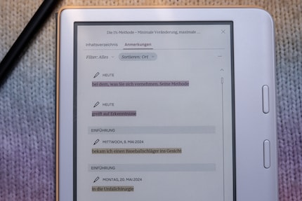 I think it’s great you can view the highlights in an overview in case you’ve marked an important part and want to go back to it. To do this, you click on the paper icon at the bottom of the book. The e-reader then opens the highlights, sorted in the order in which they appear in the book. You can also sort them by recently added.
