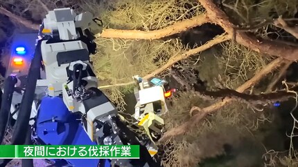 This is what it looks like when it is working on a damaged tree near the track after a storm. Thanks to headlights, he can also get to work at night: