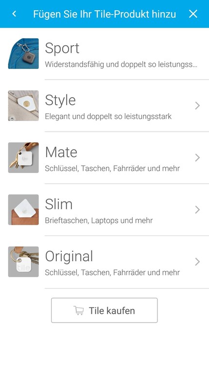 La prima cosa che devi fare è creare un account Tile. Questo richiede il tuo nome e il tuo indirizzo e-mail. Quando apri l'app per la prima volta, la selezione è ancora vuota. Ti verrà chiesto di collegare la tua app a Tiles. A proposito, in inglese si pronuncia "part", ovvero "parte", come le parti a cui si collegano le Tile. Buon gioco di parole.