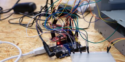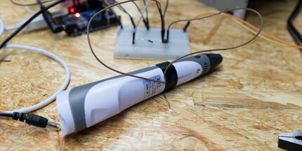 Der 3D-Druckstift ersetzt das Hot-End, die Düse und den Vortrieb des Druckers. Der Stift erhitzt das Filament und drückt es verflüssigt über die Düse auf die Bauplatte. Damit das funktioniert, muss ich den Vortrieb des Druckstifts per Software steuern können. Dazu verbinde ich den Knopf des Stifts, welcher den Vortrieb steuert, über Jumperkabel mit dem Arduino. Dieser soll dann über die Software bestimmen, wann der Knopf betätigt wird und wann nicht. Das Ganze ist komplizierter, als es sich anhört. Wenn du genau wissen willst, wie’s funktioniert, schau dir die Anleitung von gigafide an.