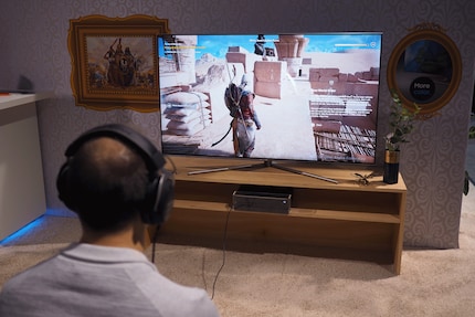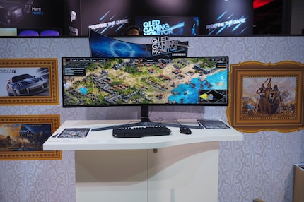 Wenn du mit «Assassin’s Creed» nichts anfangen kannst, dann lauf einmal um den Stand herum und bestaune den monstermässigen 49-Zoll-Monitor von Samsung. Wir hatten das Gerät auch schon ausgestellt in unserem Shop. Leider lief darauf nicht die verbesserte Version von «Age of Empires». Ich sag dir, das musst du gesehen haben. Ein derart altes Spiel auf der ganzen Breite des Monitors sieht einfach herrlich abgefahren aus.