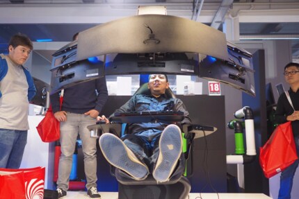 Stand 412: Joule Performance bauen ja auch für digitec richtig edle Gamer-PCs. An der Zurich Game Show haben sie neben ihren wassergekühlten Monster-Kisten noch ein besonderes Zückerchen für Gamer bereit gestellt. Das Setup sieht aus wie eine gigantische VR-Brille, die du dir aufsetzen kannst – und zwar per Knopfdruck. Danach kannst du dir die volle Dröhnung «Battlefield 1» geben.