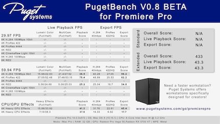 Der Benchmark lässt Medien in den Formaten 4K H.264 mit 150 Mbps in 8 bit (59.94 FPS), 4K ProRes 422 16 bit (59.94 FPS) und 4K RED (59.94 FPS) laufen. Dabei testet er Live Playback in Adobe Premiere Pro und den Export. Beim Live Playback ist ein Wert von 100 maximal, da Premiere die Medien nicht schneller wiedergeben kann als vorgegeben. Beim Export hingegen sind über 100 Punkte machbar, da das Rendern nicht auf die FPS des Mediums beschränkt ist.