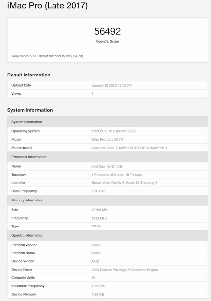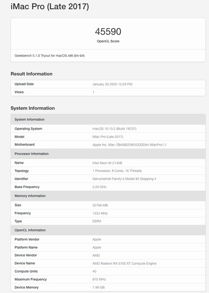 Um das zu testen, machen wir den OpenCL-Benchmark von Geekbench 5. Auch hier: Armins iMac Pro schlägt sich mit Vega 56 besser als mit der 5700 XT eGPU. 56 492 Punkte mit der Vega 56 stehen 45 590 Punkten mit der 5700 XT gegenüber. Ein Blick auf die Systeminformationen zeigt: Da kann etwas nicht stimmen. Statt 1670 MHz Takt wird eine maximale Taktfrequenz von 875 MHz ausgewiesen. Armin und ich vermuten, dass die Karte von macOS nicht richtig erkannt wird, obwohl Apple die Karte offiziell unterstützt.