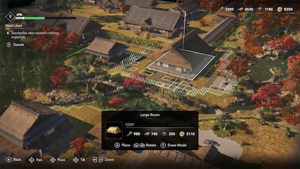 Zwischen den Missionen kehre ich immer wieder in Naoes und Yasukes Versteck zurück. Das baue ich im Spielverlauf mit neuen Einrichtungen wie einer Schmiede und einem Dojo aus. Diese erlauben es mir, neue Upgrades für Rüstungen und Waffen herzustellen.