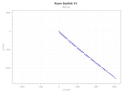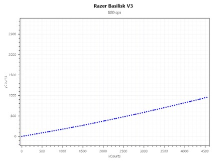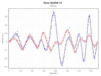 Der Sensor der Basilisk V3 verfolgt die Bewegungen gut. Bei schnellen Richtungswechseln hat er jedoch Probleme und kommt nicht ganz nach. Das ist an der blauen und roten Linie und den darüber beziehungsweise darunter liegenden Punkten zu erkennen. Beim Gamen ist mir das jedoch nicht aufgefallen.