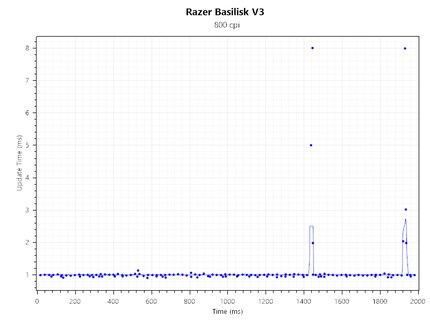 Die Polling-Rate ist grösstenteils konsistent. Es gibt ein paar wenige Ausreisser, aber die lassen sich an zwei Händen abzählen. Sonst liegt die Aktualisierungszeit bei einer Millisekunde. Es gibt allerdings Mäuse wie die Roccat Kone Pro oder Pro Air, die weniger und kleinere Ausreisser haben. Alles in allem performt die Basilisk jedoch solid.