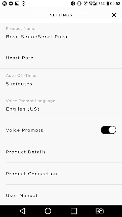 Die Einstellungen sind wenige und können grösstenteils ignoriert werdenUm ehrlich zu sein, habe ich die App genau einmal verwendet: Um die Kopfhörer schnell einem Update zu unterziehen. Denn Bose realisiert, dass Leute vor, während oder nach dem Training keine Lust haben, gross an einem Smartphone rumzudrücken. Daher: Ein Druck auf den rechten Ohrstöpsel und die Frauenstimme sagt bei mir «Connected to V20», wobei V20 als «Vee-Two-Zero» mit leicht fragendem Unterton ausgesprochen wird. V20 wird bei dir wohl ein anderes Phone sein.