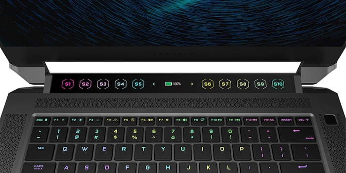 Oberhalb der Tastatur, die über mechanische Cherry MX Ultra-Low Profile Switches verfügt, befindet sich eine Touchbar mit zehn Tasten. Diese wird mit der Elgato Stream Deck Software betrieben. Eine 1080p-Webcam sowie ein integriertes Mikrofon mit Noise Canceling gesellen sich zu den Eingabegeräten.