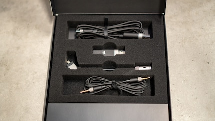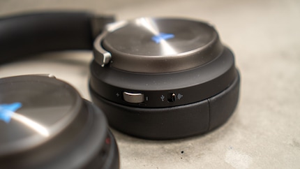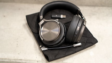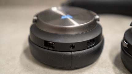 Die Bedienknöpfe befinden sich an der rechten Ohrmuschel hinten. Bei einem handelt es sich um ein Drehrad zum Verstellen der Lautstärke, mit dem anderen wählst du die Verbindungsart – USB oder Wireless. An der linken Ohrmuschel schliesst du das Mikrofon an. Ebenfalls links befinden sich ein 3.5-Klinken- und der USB-C-Ladeanschluss. Zwischen Lade- und Klinken-Anschluss befindet sich die LED-Batteriestatusleuchte. Die gibt dir in grün, orange oder rot Auskunft über den Ladezustand.