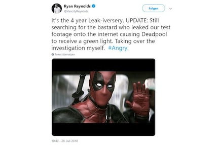 «Heute ist das Vier-Jahres-Jubiläum. Update Juli 2018: Wir suchen immer noch nach dem Bastard, der unser Testmaterial ins Internet geleakt und damit grünes Licht für Deadpool erwirkt hat. Zeit, die Ermittlungen selber in die Hand zu nehmen. #Wütend»
