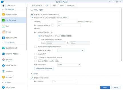 Warum? Weil je nach Umfeld herrschen andere Sicherheitsvorkehrungen. Wenn du in einem Intranet arbeitest, weder NAS noch Computer sich in der Verbindung aus deinem LAN bewegen müssen, dann kann ein FTP Server wie oben beschrieben unter Umständen genügen. Sobald aber eine Verbindung über das Internet läuft, dann muss eine Form der Encryption her. Welche? Das überlasse ich dir.