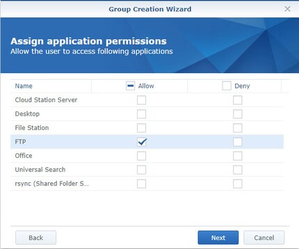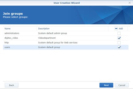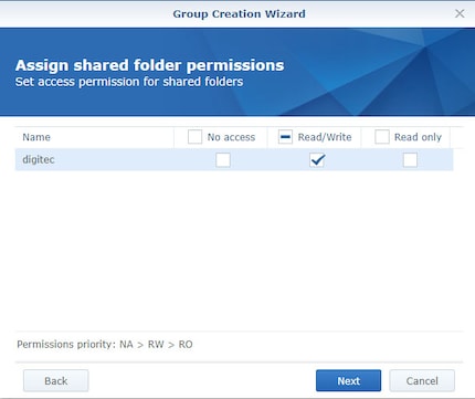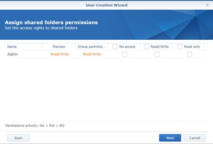 Wichtig: Die Berechtigungen der User Group sind nicht granular, sie sind also nicht detailliert sondern mehr eine Art Baseline für die Berechtigungen der Benutzer. Im Wesentlichen stellst du in einer User Group fest, auf welches Share die User zugreifen und welche Berechtigungen die User der Gruppe minimal haben sollen. Granulare Berechtigungen werden nachher bei der Generierung der User vergeben.