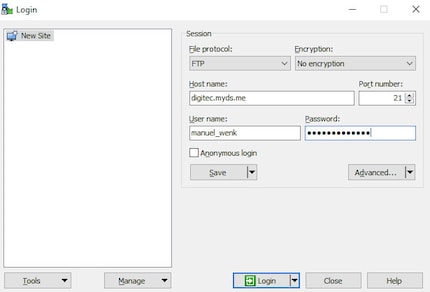 Die Einrichtung des FTP Clients ist recht einfach und geradlinig. Nach dem Download einfach WinSCP öffnen. Wenn du nur FTP nutzt und keine weiteren Sicherheitsvorkehrungen getroffen hast – wovon ich dir explizit ausserhalb von Systemtests und Beispielen abrate – dann sehen die Einstellungen so aus. Der Kern des Problems mit FTP ist, dass FTP und Encryption sich nicht besonders gut vertragen.