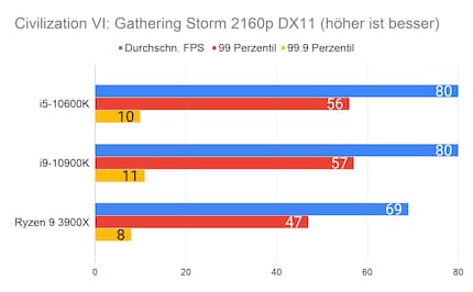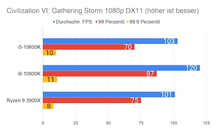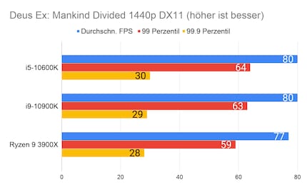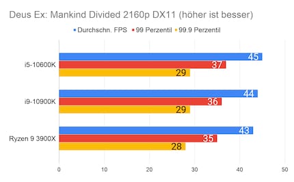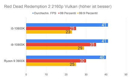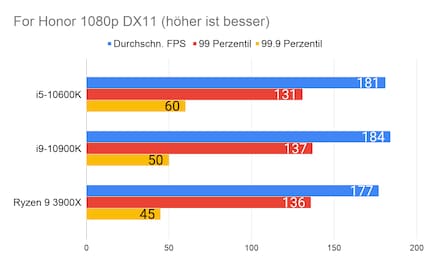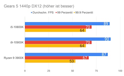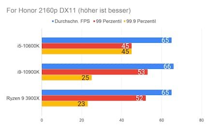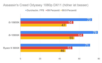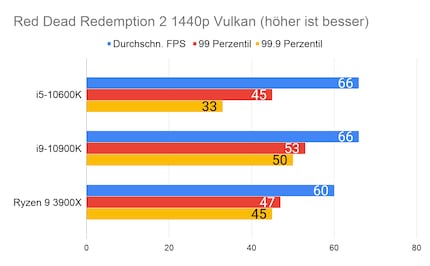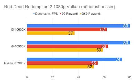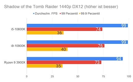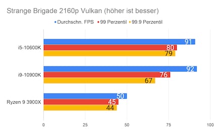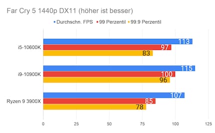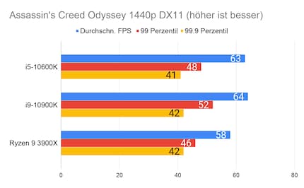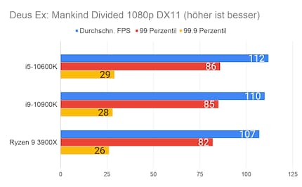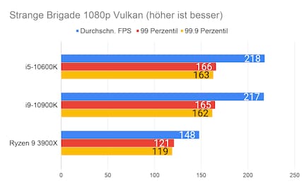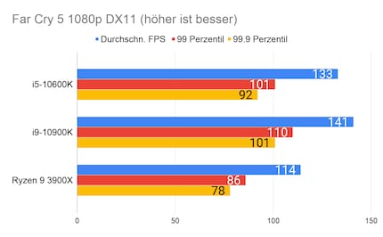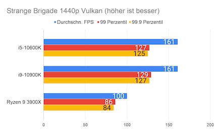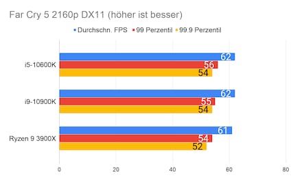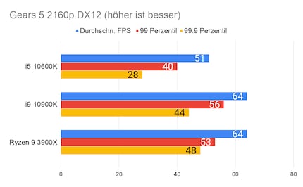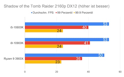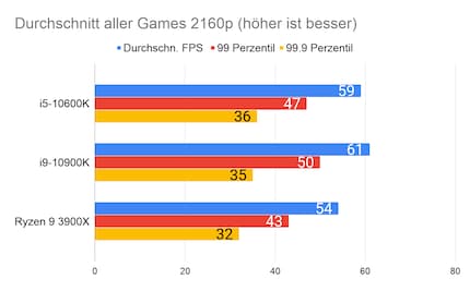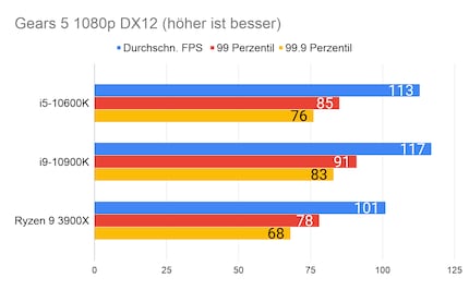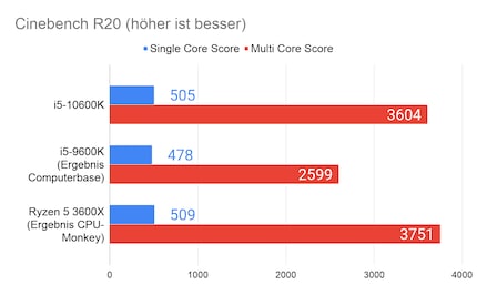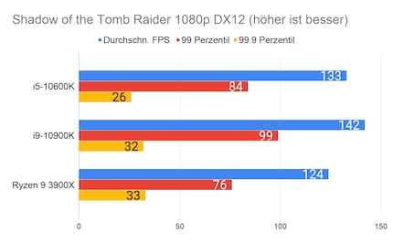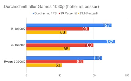 Leider fehlen mir Vergleichswerte des 3600X und 9600K auf unserer Testbench. Deshalb liefere ich dir zum Vergleich die Resultate des 10900K von Intel und 3900X von AMD.