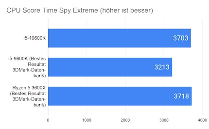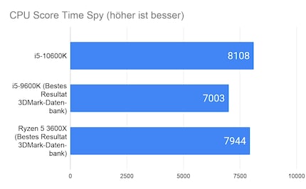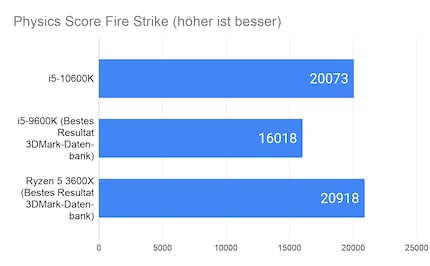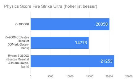 Die synthetischen Game Benchmarks lassen einen ersten Blick auf die Leistung in Games zu. Ich verzichte auf die Angabe des Overall Scores, der sich aus den Ergebnissen der Grafikkarte und CPU berechnet. Dies, weil die GPU-Wertung sehr inkonsistent ist. Hier hatte ich Unterschiede von über 1000 Punkten. Das verfälscht das Ergebnis enorm. Damit du dir ein besseres Bild von der Leistung des i5-10600K machen kannst, ziehe ich als Vergleich das Top-Ergebnis des Vorgängers i5-9600K und des Ryzen 3600X in Kombination mit einer 2080 Super aus der 3DMark-Datenbank . Der 9600K ist in den meisten Fällen übertaktet, der 3600X läuft gemäss den Angaben von 3DMark auf Stock-Einstellungen.
