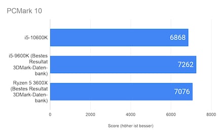 Der PCMark 10 Benchmark testet diverse Szenarien wie Ladezeit von Apps, Effizienz bei Tabellenkalkulationen, Browsen oder auch Foto- und Videobearbeitung. Daraus berechnet er einen Score. Mit seinen 6868 Punkten schneidet der 10600K rund sechs Prozent schlechter ab als das beste Ergebnis eines i5-9600K in der 3DMark-Datenbank mit vergleichbarem Setup wie unsere Testbench. 3DMark ist der Vertreiber des Benchmarks. Der besagte 9600K ist gemäss Datenbank jedoch übertaktet. Der 3600X schneidet drei Prozentpunkte besser ab. Er scheint gemäss Datenbank nicht übertaktet zu sein.