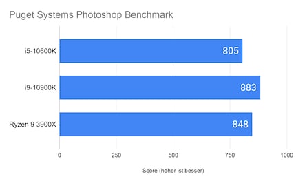 Beim Photoshop Benchmark von Puget Systems werden verschiedene Workloads durchgeführt. Genauere Infos findest du hier. Am Schluss berechnet der Benchmark einen Score, der sich an einer Referenzworkstation orientiert. Hier fehlen mir ebenfalls die Resultate von 9600K und 3600X. Im Vergleich zu den «Grossen» i9-10900K und Ryzen 9 3900X schlägt sich der 10600K nur rund zehn respektive fünf Prozent schlechter.