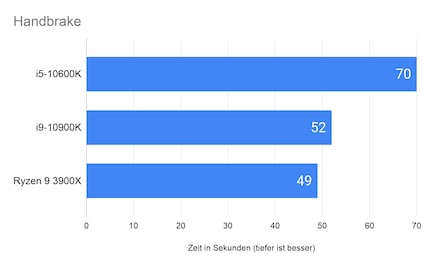 Für Handbrake fehlen mir Vergleichsdaten von den Prozessoren 9600K und 3600X. Den 88 Sekunden langen, 645 MB grossen 4K Trailer von «The Dark Knight Rises» encodiert der 10600K mit den «Fast 1080p30»-Voreinstellungen von Handbrake in 70 Sekunden. Verglichen mit dem i9-10900K ist das rund 25 Prozent langsamer.