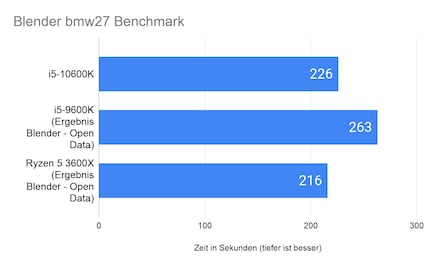 Für Blender-User bedeutet der i5-10600K einen riesigen Schritt nach vorn. Im Vergleich zum i5-9600K rechnet das neue Flaggschiff rund 14 Prozent schneller. Jedoch bleibt er rund vier Prozent hinter dem Ryzen 5 3600X.