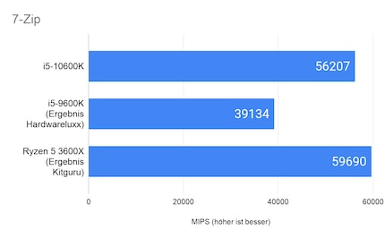 Im integrierten Benchmark von 7-Zip – ich wähle die Standard «Dictionary size» von 32 MB – erreicht der 10600K 56 207 Instruktionen pro Sekunde (MIPS). Das sind knapp 44 Prozent mehr als das Ergebnis von Hardwareluxx beim Vorgänger 9600K. Der Ryzen 3600X schafft gemäss Kitguru rund 6 Prozent mehr MIPS.