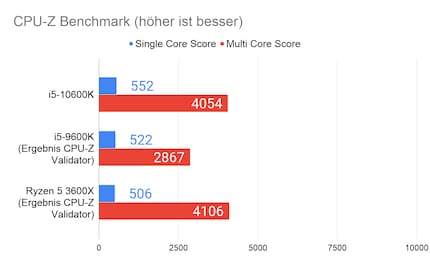 Bei den Vergleichsresultaten von CPU-Z bediene ich mich bei der Datenbank CPU-Z Validator. Du kannst also davon ausgehen, dass die Ergebnisse von übertakteten Prozessoren stammen. Der 10600K leistet rund sechs Prozent mehr als der Vorgänger im Single Core und dank den zwei Kernen mehr rund 41 Prozent mehr im Multi Core. Im Vergleich zum Ryzen 3600X leistet der i5-10600K nur ein Prozent weniger.