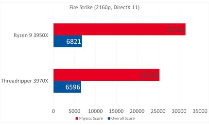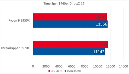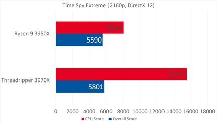 Der Threadripper erreicht rund 8 Prozent mehr Punkte als der Ryzen 3950X. Interessanterweise ist der Unterschied beim GPU Score gross. Es scheint, als ob der 3970X besser mit der Grafikkarte zusammenarbeitet als der 3950X.