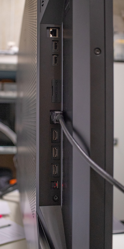 Wenn ich mich vor das Ding setze, stelle ich fest: Als PC-Monitor taugt es nichts. 80 Zentimeter Abstand sind für die Grösse des Omen X Emperium viel zu wenig. Da bekomme ich «Äckegstabi» – «Halschehri» für die, die kein Berndeutsch sprechen. Im Studio habe ich immerhin die Möglichkeit, den Monitor auf einen anderen Tisch zu stellen, damit mein Sitzabstand auf etwa zwei Meter anwächst. Damit kann ich leben und verbinde ihn mit einem Displayport Kabel und unserem Gaming-PC.