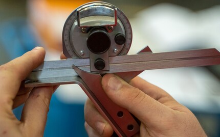 Bevor David aber anfangen kann, muss er noch den korrekten Stempel und die Matrize in die Maschine spannen. Danach ist alles parat. Er überlegt sich, welche Seite er zuerst in die Maschine führen muss. Danach legt er sein Chromstahlteil auf die Matrize und betätigt den Stempel. Dieser drückt den PC-Fuss in Form. David misst den Winkel nach. Er ist noch nicht zufrieden. Es muss alles ganz genau stimmen. Er nimmt weitere Anpassungen vor und biegt nach. Jetzt ist er zufrieden. Nur noch drei Mal abkanten und dann ist der erste Fuss fertig.