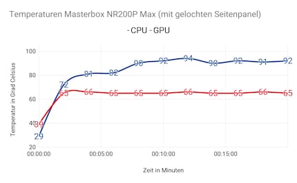 Noch ein paar Worte zur Lautstärke: Mit dem gelochten Seitenfenster erzeugen die Komponenten im Gehäuse 1 dB mehr Schall. Ich messe mit jeweils 30 Zentimetern Abstand zur Front: 40 dB im Leerlauf und 43 unter Last.