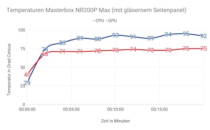 Wie zu erwarten sind die Temperaturen mit Glasfenster höher als mit gelochtem Seitenpanel. Die Unterschiede sind jedoch mit zehn Grad Celsius nur bei der Grafikkarte gross. Bei der CPU beträgt die Differenz nur wenige Grad Celsius oder ist gar nicht vorhanden. Die CPU drosselt jedoch bei der Konfiguration mit Glaspanel, um 200 MHz. Das liegt daran, dass sie an ihr thermisches Limit gerät. Sie wird also zu heiss. Deshalb schwankt die Temperatur gegen Ende des Tests. Bei der Konfiguration mit gelochtem Seitenpanel, kann die CPU den Takt jedoch halten.