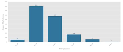 Vom jüngsten Alter von 16 bis zum höchsten Alter von 65 Jahren gibt es fast in jedem Alter mindestens einen Mitarbeiter. Lediglich 60 und 64 Jahre alt ist zum jetzigen Zeitpunkt niemand. Der grösste Anteil ist 26 Jahre alt (112 Mitarbeiter), das entspricht 6.7% unserer Belegschaft.