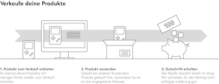 Der Verkäufer wählt den Artikel aus seiner Liste im Kundenkonto unter der Rubrik «Produkte verkaufen», beschreibt den Zustand des Artikel und wählt den Verkaufspreis. Optional können Verkäufer zusätzliche Fotos ihrer Angebote hochladen. Zeig die Schoggiseite deiner Produkte und los geht's.