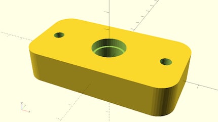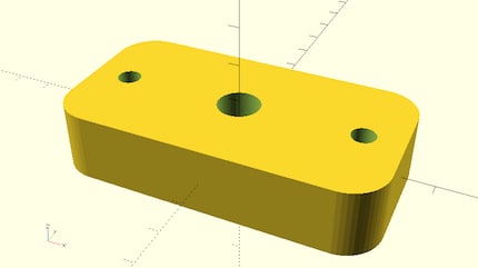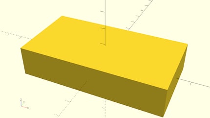 Grundquader als Ausgangslage.Mit der Anweisung «center=true» wurde das Objekt eingemittet. Der Nullpunkt ist also genau in der Mitte. Dies ist in unserem Fall sehr praktisch, da das Objekt symmetrisch ist, also beide Seiten gleich gross. Dadurch sind die Löcher fürs Gewinde und die Schraube in der Mitte und wir müssen für die folgenden M5-Löcher weniger rechnen.