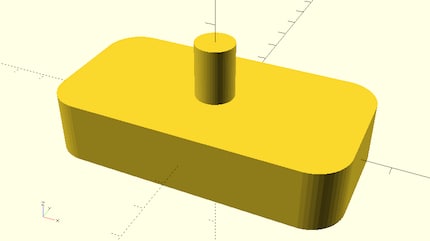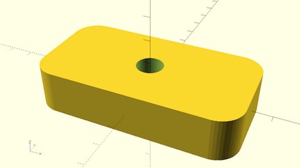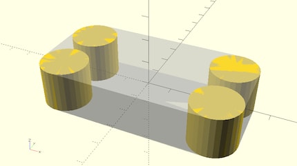 Quader mit abgerundeten Ecken.Fügen wir nun die Löcher hinzu, indem wir verschiedene Zylinder hinzufügen. Diese werden dann vom grossen Objekt weggerechnet («gebohrt»):