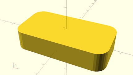Da nur die Aussenkanten abgerundet sind, nutzen wir die Funktion «hull», welche eine Hülle um die Objekte zieht. Nun wird es etwas mathematisch: Die Abrundung hat einen Radius von 10 mm, also platzieren wir 4 Zylinder an den Ecken und spannen die Hülle darum: