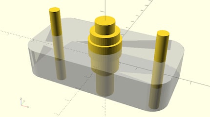 «for»-Schleifen sind ein praktisches Hilfsmittel beim Programmieren, aber zurück zum Adapter. «Bohren» wir nun das Loch, indem wir die Differenz von A minus B bilden. Grosses hull Objekt minus Schrauben-Zylinder mit der Funktion «difference»: