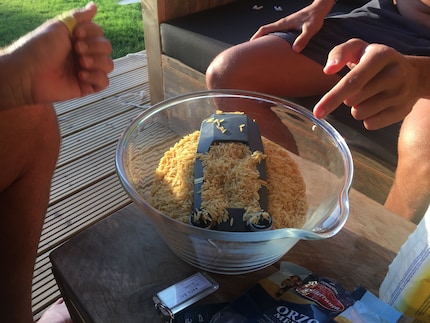 Oliver legt die Drohne in 2.5 Kilo Reis ein, und hängt sie zwei Tage lang an der Sonne an einen Baum, um die Feuchtigkeit aus der Drohne zu kriegen. Dann probiert er die Drohne nochmals fliegen zu lassen.