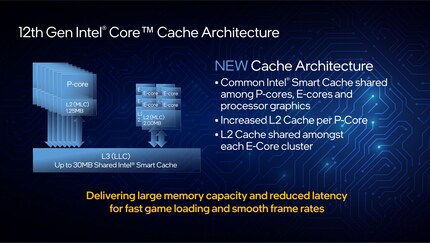 Der Flaggschiff Alder-Lake-S-Prozessor i9-12900K verfügt über 30 MB gemeinsam genutzten L3-Cache, auf den alle Komponenten des Chips zugreifen können: P-Kerne, E-Kern-Cluster, iGPU, Speicher-Controller usw. Jeder der acht P-Cores verfügt über einen dedizierten 1,25 MB grossen L2-Cache. Jeder E-Kern-Cluster verfügt über einen 2 MB grossen L2-Cache, der von den vier E-Kernen gemeinsam genutzt wird.