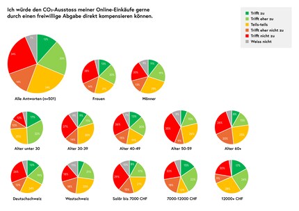 Alle anzeigenAuch wenn das Thema ob der Corona-Pandemie vorübergehend in den Hintergrund gerückt ist: Shoppen belastet die Umwelt. Der Abbau der Rohstoffe, die industrielle Herstellung der Produkte oder der Transport um den Globus blasen tonnenweise CO2 und andere Schadstoffe in unsere Atmosphäre. Wir haben nachgefragt, ob die Schweizer Konsumenten den CO2-Fussabdruck ihres Online-Konsums durch eine freiwillige Abgabe kompensieren würden. Dazu haben wir beim Marktforschungs-Institut GfK eine repräsentative Umfrage in Auftrag gegeben. Befragt wurden 501 Menschen in der Deutschschweiz und der Romandie.