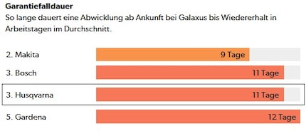 Unter «Garantiefalldauer» sieht die Kundschaft, wie lange es im Schnitt dauert, bis ein Produkt einer Marke in der jeweiligen Kategorie bei einem Garantiefall zurück beim Besitzer oder bei der Besitzerin ist. Ins Ranking fliessen hier ebenfalls die Daten der letzten 24 Monate ein. Bei Rasenmähern von Husqvarna dauert es beispielsweise in der Regel elf Tage, bis ein Ersatz da oder die reparierte Maschine zurück ist. Die Konkurrenz von Einhell schafft dasselbe in durchschnittlich fünf Tagen.