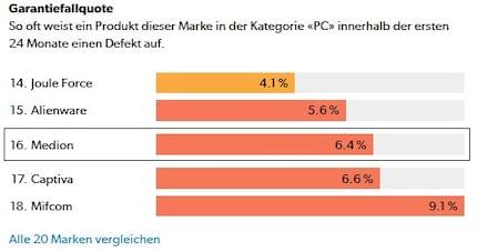 Unter «Garantiefallquote» zeigt Digitec Galaxus, wie häufig Produkte einer Marke in der jeweiligen Kategorie in den ersten 24 Monaten nach Kauf einen Defekt aufwiesen. PCs der Marke Medion werden z.B. in knapp 6,4 Prozent aller Fälle innert zwei Jahren zum Garantiefall, bei Apple-Computern liegt die Quote dagegen bei 0,8 Prozent. «Die Garantiefallquote ist ein guter Indikator für die Qualität von Produkten», sagt Zara. «Nun sehen die Konsumentinnen und Konsumenten erstmals verlässliche Statistiken zu Defekten, die das Bauchgefühl, Experten-Reviews und Produktbewertungen anderer Kundinnen und Kunden ergänzen.»