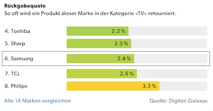 Unter «Rückgabequote» ist ersichtlich, wie oft in den letzten 12 Monaten Produkte einer Marke in der jeweiligen Kategorie retourniert wurden. Ein Beispiel: Die Kundschaft hat in den letzten 12 Monaten 2,4 Prozent aller bei Galaxus oder Digitec gekauften Samsung-TVs zurückgegeben.