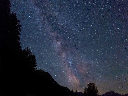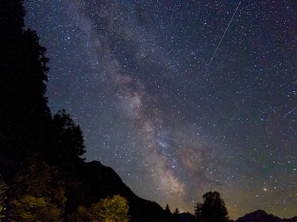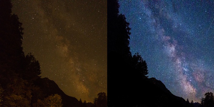 Ein Nachthimmel ist dunkel. Muss also der Himmel möglichst dunkel eingestellt sein? Nein, denn wichtig für den Eindruck ist die relative Helligkeit: Der Himmel ist heller als die Gebirgskette. Diesen Unterschied will ich durch die Nachbearbeitung besser sichtbar machen. Das Ziel ist also eine Gebirgskette, die als schwarze Silhouette erscheint, vor einem deutlich helleren Himmel.