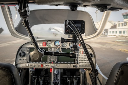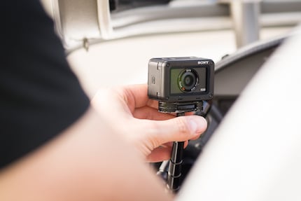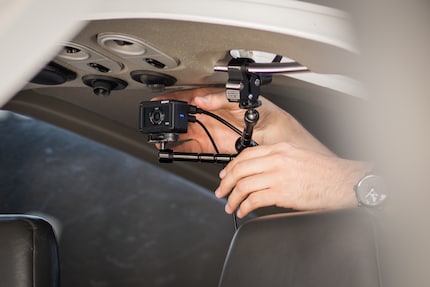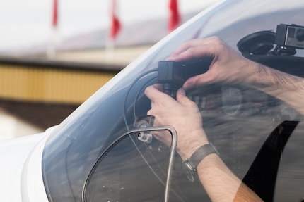 Die Befestigung der Sony RX0 im Flugzeug - dank dem 1/4" Zoll Gewinde an der Unterseite der Kamera einfacher als bei einer GoProBei solchen Projekten filmen wir meist in einem kleinen Team, mit Equipment, das kompakt und mobil ist. Das gibt uns die Möglichkeit, auf dem Set sehr agil zu sein. Als Hauptkamera benutzen wir unsere Canon EOS C300 MKII, speziell bei diesem Dreh hatten wir zusätzlich noch die neue Canon EOS C200, eine Panasonic GH5 und GoPros im Einsatz - und die brandneue Sony RX0.