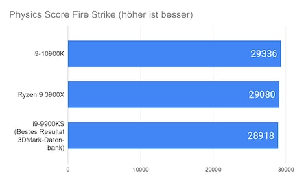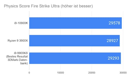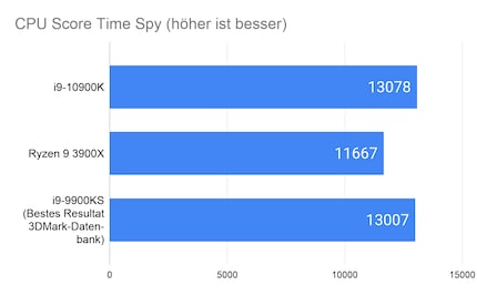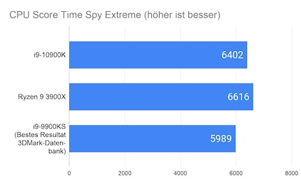 Der 10900K ist bis auf Time Spy Extreme immer am schnellsten. Hier scheint der Ryzen 9 3900X von den zwei Kernen mehr zu profitieren. Über alle vier Benchmarks hinweg ist der 10900K rund drei Prozent schneller als der 3900X und zweieinhalb Prozent schneller als der 9900K. Der Vergleich zum 9900K scheint gering, bedenkst du jedoch, dass der 9900K übertaktet ist und der 10900K mit Stock-Einstellungen läuft, geht das Resultat in Ordnung.