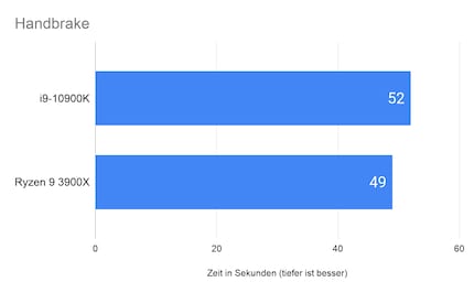 Auch in Handbrake bleibt der i9-10900K hinter dem 3900X. Den 88 Sekunden langen, 645 MB grossen 4K Trailer von «The Dark Knight Rises» encodiert der Intel Chip mit den «Fast 1080p30»-Voreinstellungen von Handbrake rund sechs Prozent langsamer.